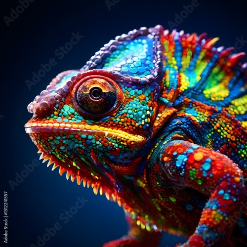© Archmotion.net, Fototapeta premium A vibrant, colorful chameleon with striking patterns on its skin stands against a dark blue background in an artistic photograph.