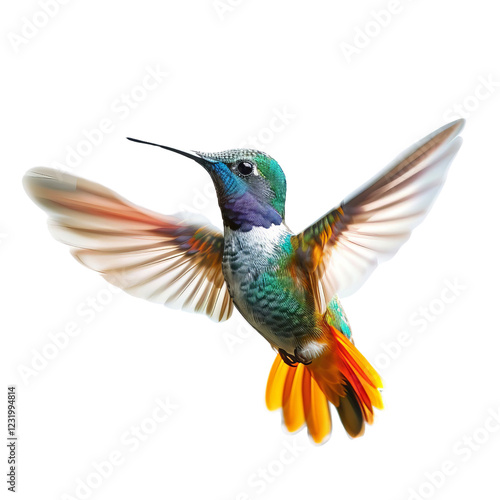 Obraz premium A vibrant, colorful hummingbird in mid-flight against a white background,...