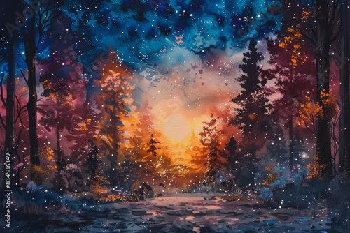 © InkCrafts, Fototapeta premium A vibrant, colorful painting depicting a magical forest with trees lit by warm sunset light against a starry night sky.