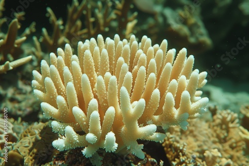 Naklejka premium A vibrant coral formation under clear water, showcasing unique textures and colors that contribute to marine biodiversity.