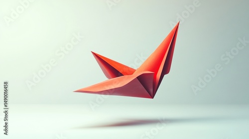 © Satria, Naklejka premium A vibrant, coral-red origami-style bird in flight, rendered in a minimalist, 3D style against a stark white backdrop, casting a subtle shadow. The piece