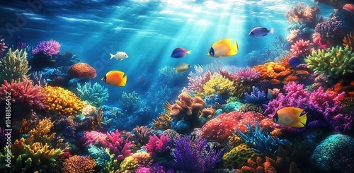 Naklejka premium A vibrant coral reef teeming with colorful fish, sunlit and shimmering under...
