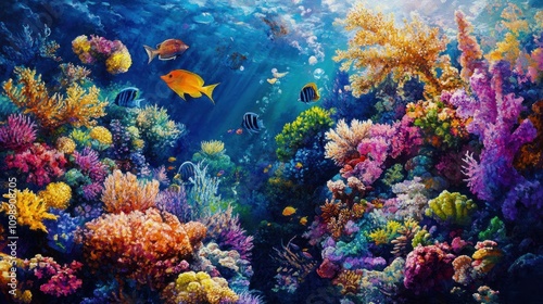 Naklejka premium A vibrant coral reef teeming with colorful marine life.