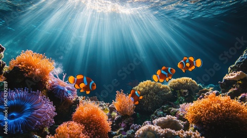 © Sibghat , Fototapeta premium A vibrant coral reef teeming with orange clownfish and bright blue starfish