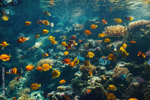 Naklejka premium A vibrant coral reef teeming with various species of colorful fish.
