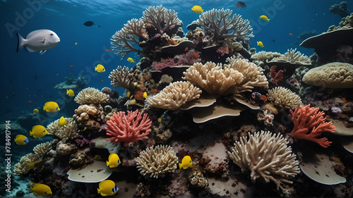 Fototapeta premium A vibrant coral reef teems with life, including schools of yellow fish and...