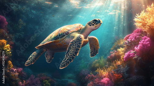Naklejka premium A vibrant coral reef with a turtle swimming grace_0425