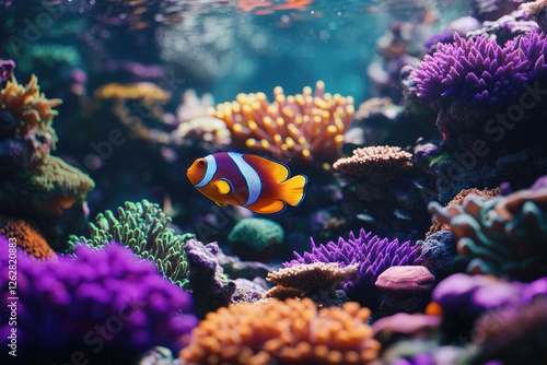 Fototapeta premium A vibrant coral reef with colorful corals and tropical fish, under the blue...