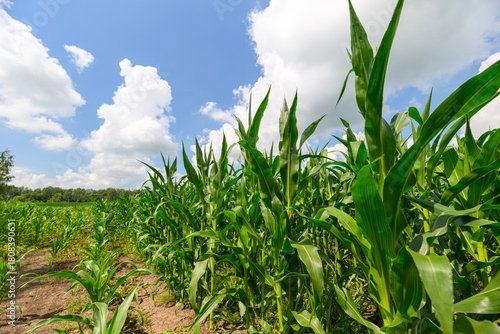 Obraz premium A Vibrant Cornfield Set Under an Expansive Clear Blue Sky During a Warm...