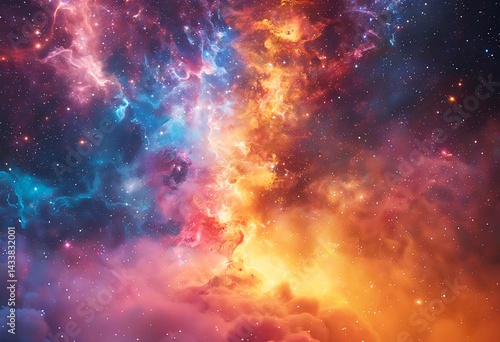 Naklejka premium a vibrant cosmic nebula displays a stunning contrast between cool blues and fiery oranges, speckled with distant stars.