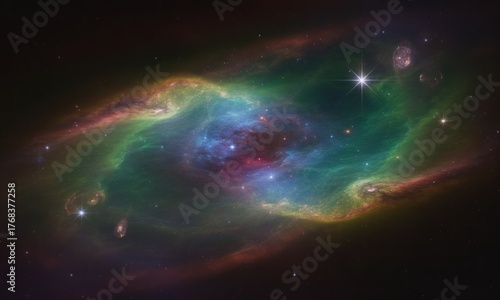 Fototapeta premium A vibrant cosmic nebula glows with swirling gases and bright starlight, a colorful display