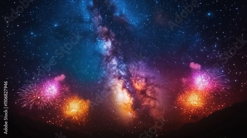 Naklejka premium A vibrant cosmic scene featuring a galaxy and colorful fireworks in a starry...