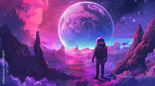© Waa, Obraz premium A vibrant cosmic scene featuring an astronaut against a colorful planet backdrop.