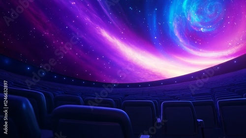 Fototapeta premium A vibrant cosmic scene projected in a modern planetarium, showcasing swirling...
