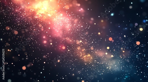 © Background, Fototapeta premium A vibrant cosmic scene with colorful stars and glowing particles in a dark space background.