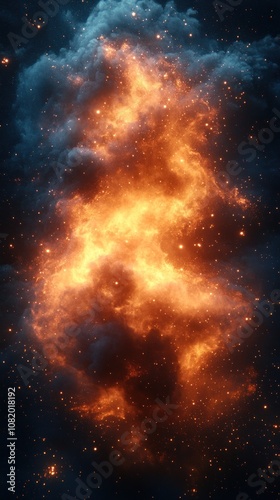 © julio, Fototapeta premium A vibrant cosmic scene with fiery orange and dark blue hues.