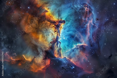 Fototapeta premium A vibrant cosmic space swirling with colorful stars and nebulae, A cosmic nebula swirling with iridescent hues