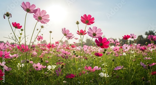 Naklejka premium A vibrant cosmos field under the bright sun on a beautiful summer day