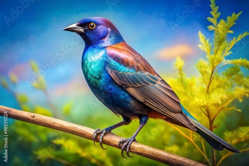 © Wanlop, Fototapeta premium A vibrant cowbird rests gracefully on a branch, surrounded by its natural habitat, under a brilliant blue sky
