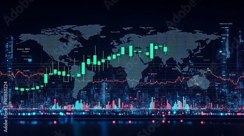 Obraz premium A vibrant cryptocurrency chart with green candlesticks rising steeply, set against a glowing world map, flashing crypto symbols marking regions of high trading activity, bright financial hubs,