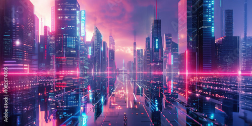 Fototapeta premium A vibrant cyberpunk cityscape at night filled with glowing neon lights reflecting on rain-soaked streets, showcasing futuristic architecture and a bustling atmosphere