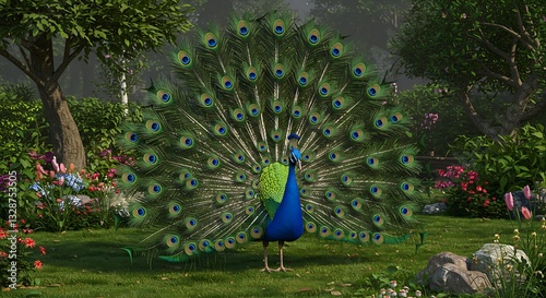 © hattaarshavin, Obraz premium A vibrant 3D peacock spreading its feathers in a lush green garden