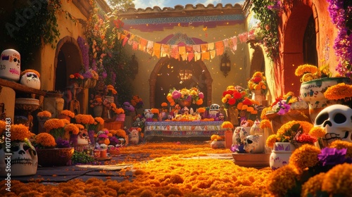 Fototapeta premium a vibrant day of the dead scene with colorful sugar skills,marigold flowers,and traditional altars,capturing the essence of celebration and remembrance in a lively real-life setting