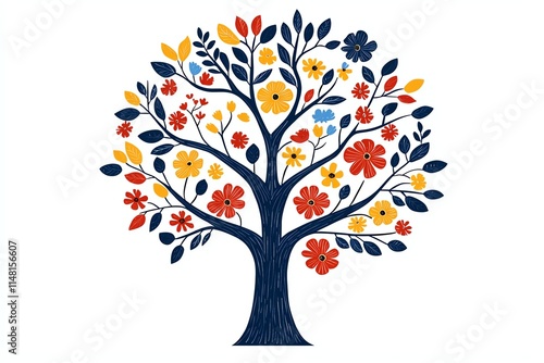 Fototapeta premium A vibrant, decorative tree illustration with colorful flowers and leaves in...