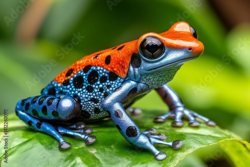 © Thanyarat, Obraz premium A vibrant Dendrobates (poison dart frog) resting on a tropical leaf, its colorful skin warning predators
