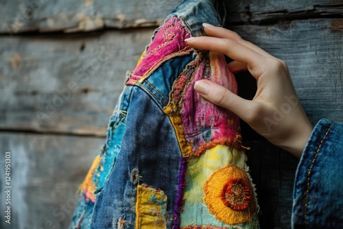 Fototapeta premium A vibrant denim jacket patched with colorful fabrics and intricate embroidery, showcasing unique style and creativity.