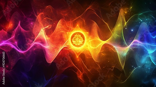Obraz premium A vibrant depiction of sound waves forming patterns around a central meditation symbol, representing the alignment of chakras through cosmic frequencies