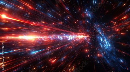 Naklejka premium A vibrant depiction of space-time travel with colorful light streaks and cosmic elements.