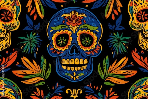 © Fotograf, Fototapeta premium A vibrant design featuring colorful skulls surrounded by flowers on a dark background.