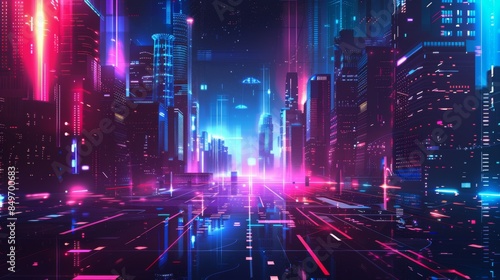 Naklejka premium A vibrant digital artwork featuring a neon-lit futuristic city, representing...