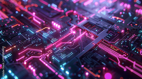 Obraz premium A vibrant digital artwork showcasing a circuit board with neon lights in pink...