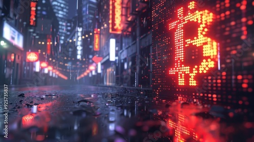 Fototapeta premium A vibrant digital bitcoin shines against a blurred urban skyline,...