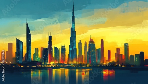 © baehaqi, Obraz premium A vibrant digital cityscape at sunset, with tall skyscrapers reflecting in a calm water body.
