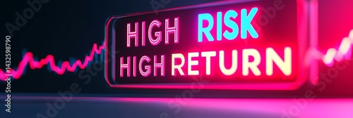 © Tanakrit, Obraz premium A vibrant digital display featuring the phrases "HIGH RISK" and "HIGH RETURN," accompanied by a rising graph line, emphasizing investment concepts.