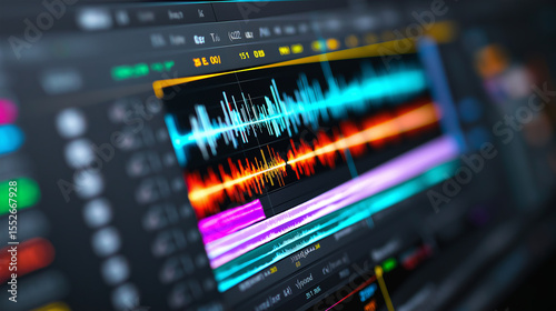 © Curioso.Photography, Obraz premium A vibrant digital display shows multiple colorful sound waves and frequency graphs, representing audio analysis, data visualization, and technological interfaces.