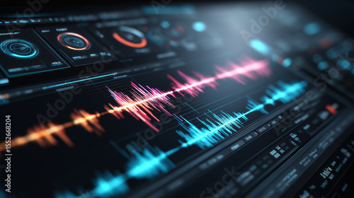 © Curioso.Photography, Obraz premium A vibrant digital display shows multiple colorful sound waves and frequency graphs, representing audio analysis, data visualization, and technological interfaces.