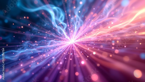 © Saksit, Naklejka premium A vibrant digital explosion of radiant blue and pink light beams with glowing particles emanating from a central bright point.