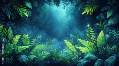 © Cucok, Fototapeta premium A vibrant digital illustration of lush green foliage in a misty forest setting.