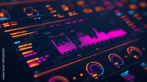 © Phatharaporn, Obraz premium A vibrant digital interface showcasing colorful audio waveforms and controls, representing advanced technology in sound visualization.
