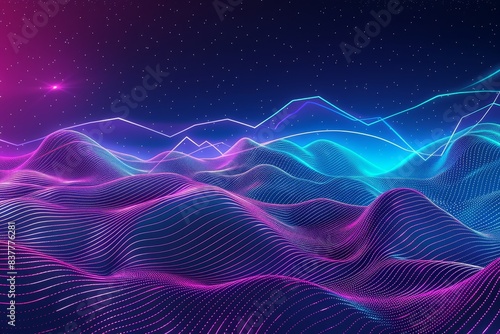 Fototapeta premium A vibrant digital landscape of neon waves and glowing lines against a starry...