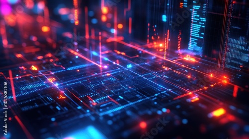 Obraz premium A vibrant digital landscape showcasing interconnected data streams and circuits.