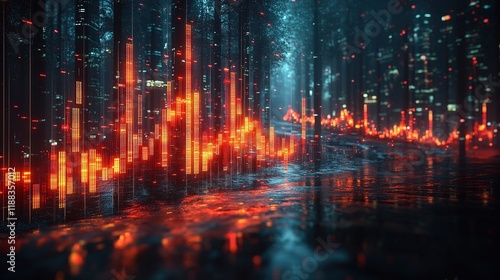 © toko, Naklejka premium A vibrant digital landscape showcasing sound wave visuals amidst a futuristic forest setting.