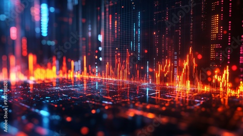 Naklejka premium A vibrant digital landscape with glowing data streams and visualizations.