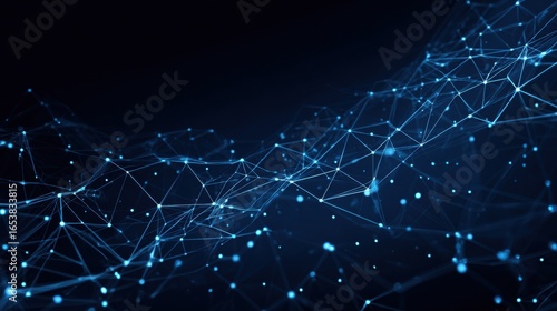 Fototapeta premium A vibrant digital network illustrates interconnected nodes and lines in dynamic blue hues, showcasing the complexity of online connections and data flow in a modern tech environment.