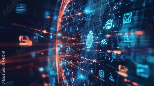 Fototapeta premium A vibrant digital network interface with glowing lines and icons representing...