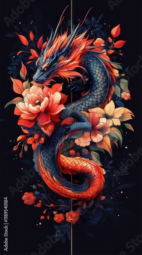 Obraz premium A vibrant digital painting of a majestic dragon entwined with blooming flowers.